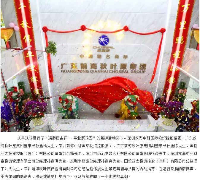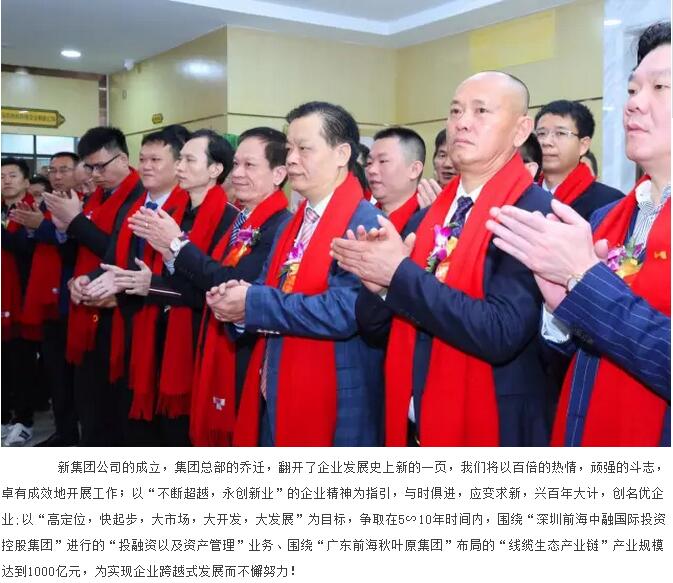 原中國人民武裝警察部隊學院院長、黨委書記、中國安全防范產品行業協會理事長柳曉川將軍,深圳市政協副主席、廣東省人民政府參事張效民先生,中共惠州市博羅縣龍溪鎮黨委書記鐘桂來先生,深圳市安防協會、深圳市職能交通協會會長楊金才先生,汕頭商會會長鄭漢名先生,孫世聯廣東分會會長孫利先生,深圳市科技金融促進會會長馬錫民先生等眾多嘉賓,和深圳前海中融國際投資控股集團、廣東前海秋葉原集團的合作伙伴家人們一起,與來自全國各地的貴賓朋友們共聚集團總部中國深圳市寶安區中糧商務公園新址,共同見證集團發展歷程中這一歷史性時刻。共同慶賀深圳前海中融國際投資控股集團開業暨廣東前海秋葉原集團總部喬遷這一象征新征程的大喜盛事。