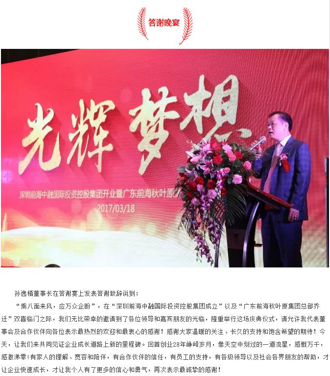 深圳前海中融國際投資控股集團、廣東前海秋葉原集團董事長孫逸楷先生作了熱情洋溢的歡迎致辭,董事長代表集團全體同仁,向各級領導、各集團事業合作伙伴以及長期信賴、支持和關心集團發展的社會各界朋友表示最熱烈的歡迎和衷心的感謝!贏得了慶典現場的熱烈掌聲。